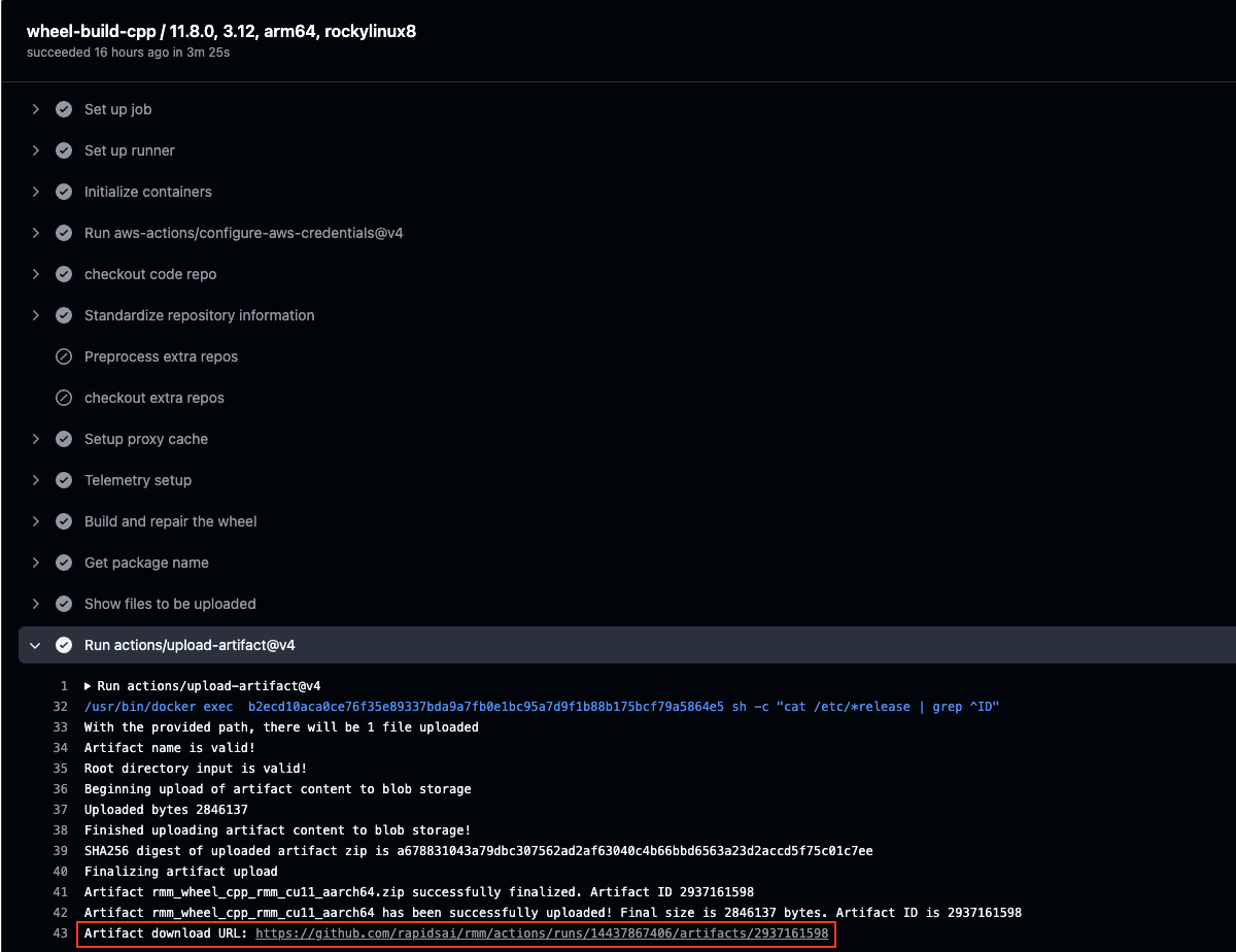 {workflow-run-id}= the unique identifier for a GitHub Actions workflow run{org}/{repo}= the repository the workflow run occurred in (e.g.rapidsai/rmm){artifact-name}= unique identifier for an artifact within one workflow run (e.g.rmm_conda_python_cuda12_py312_x86_64){destination-directory}= local directory the artifact’s contents should be decompressed to